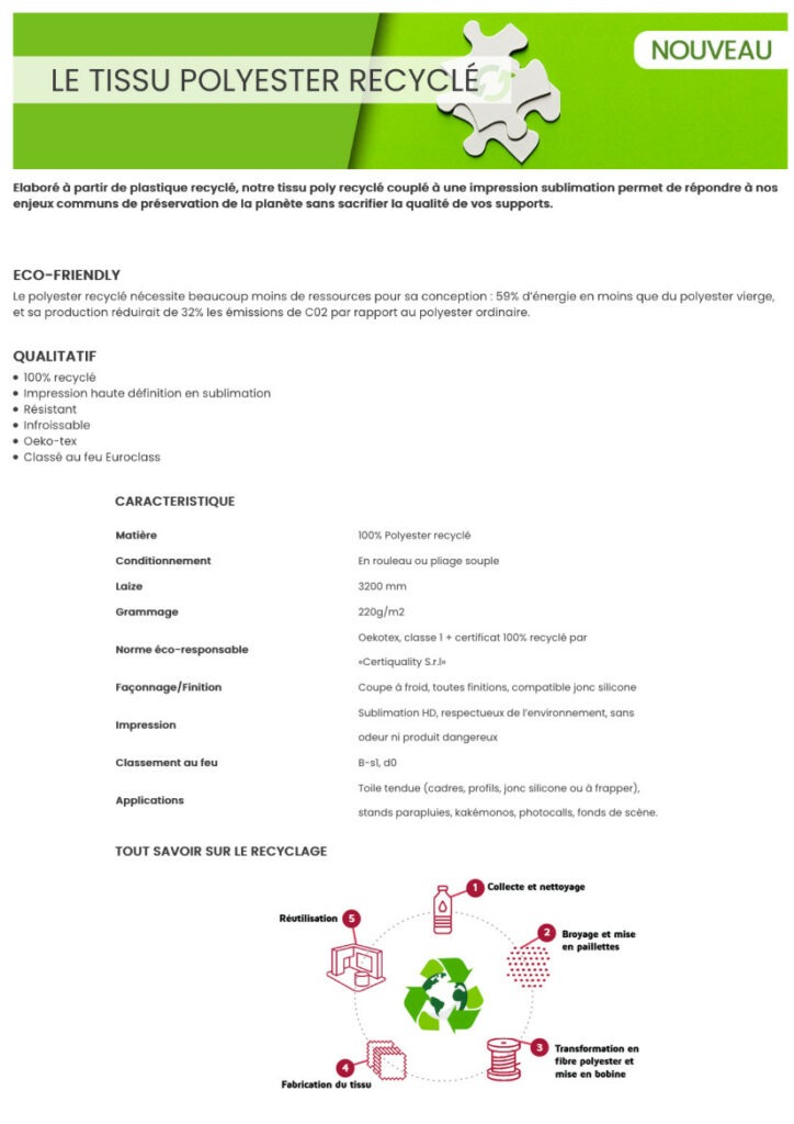 Impression par sublimation sur des tissus infroissables qui utilisent la dernière génération de polyester exempts de substances nocives (PVC, phtalates, phosphates, formaldéhyde, éther de glycol, etc…)